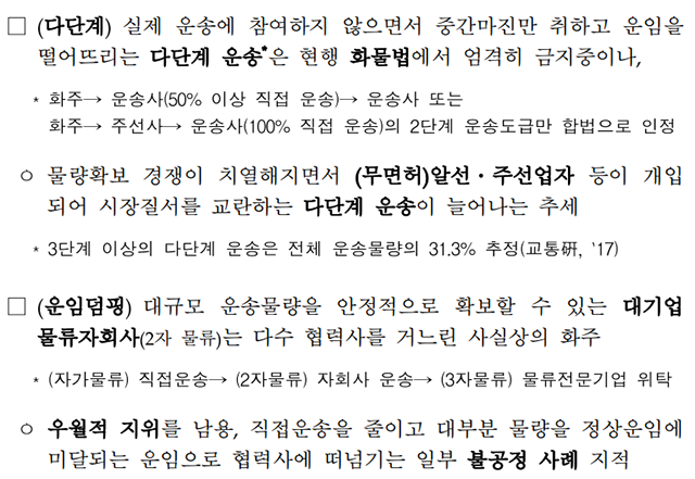 지난 2019년 관계부처 합동으로 발표된 ‘물류산업 혁신방안’4) 자료에도 “실제 운송에 참여하지 않으면서 중간 마진만 취하고 운임을 떨어뜨리는 다단계 운송은 현행 화물법에서 엄격히 금지 중”이라고 적혀 있다. 이어 대기업 물류자회사가 “우월적 지위를 남용, 직접 운송을 줄이고 대부분 물량을 정상운임에 미달되는 운임으로 협력사에 떠넘기는 일부 불공정 사례”를 지적한 바 있다. 그럼에도 지금 윤석열 정부는 효과를 보이는 제도조차 없애버리겠다며, 화물노동자들을 압박하고 있는 것이다.