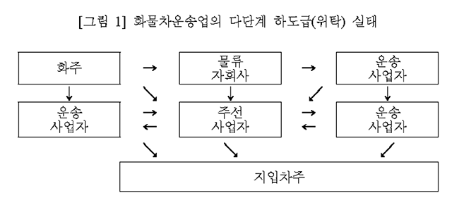 이에 대해 윤 연구원은 현행 화물자동차운수사업법도 이러한 다단계 구조를 인정하지 않는다고 지적했다. 화주가 운송사업자에게 위탁하거나 운송주선사업자를 통해 운송하는 것 이외의 위탁은 금지된다는 것이다. 그러나 현실에는 대기업 화주 아래 대기업 화주가 만든 물류자회사가 있다. 윤 연구원은 “2000년대 이후 대기업의 물류자회사를 중심으로 모기업의 화물 운송물량을 독점하고 중간 수수료 공제 후 운송회사에 일괄 위탁하는 관행이 증가하면서 다단계 구조가 더욱 심화”했다고 설명했다. “대기업이 물류자회사를 만드는 이유는 불법적 경영권 승계, 비자금, 일감 몰아주기를 위해서다”라고도 덧붙였다.