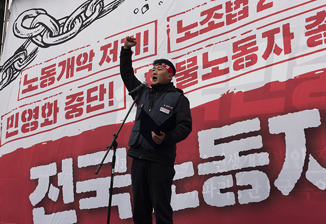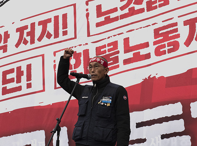 이날 투쟁사에서는 이봉주 화물연대 위원장과 지난달 30일부터 노조법 2·3조 개정을 요구하며 4일째 단식·농성을 벌이고 있는 이김춘택 금속노조 거제통영공성조선하청지회 사무장이 나섰다.