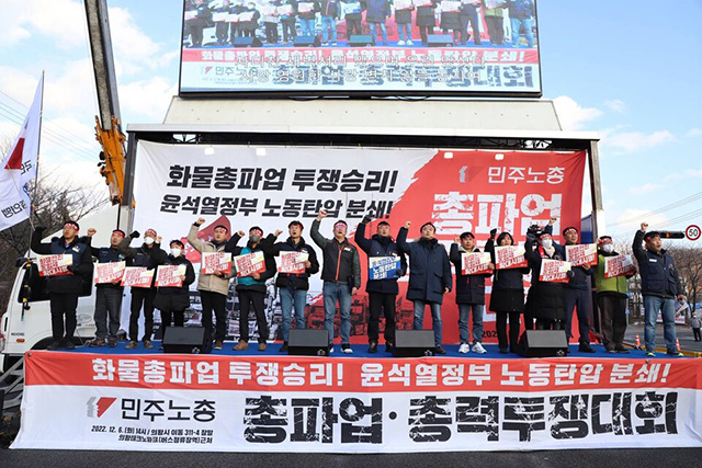 그러면서 양 위원장은 "화물연대의 파업은 화물노동자의 안전을 넘어 도로의 안전, 시민의 안전을 지키는 것이다. 화물연대의 파업은 이 땅 특수고용노동자들의 노조할 권리를 지키는 투쟁이다. 운송사가 아니라 원청인 화주, 정부와 직접 교섭해야 해결될 수 있는 문제다. 또다시 손해배상으로 겁박하는 자본과 정권에 맞서는 투쟁"이라며 "노동조합을 말살하려는 윤석열 정권에 맞서자"라고 말했다.