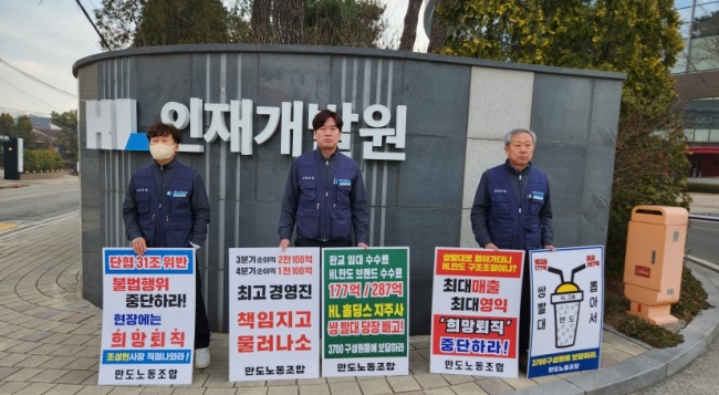 ▲ 노동조합의 한라인재개발원 앞 피켓팅 시위 [출처: 만도노동조합] |