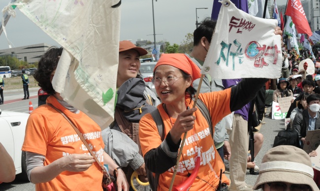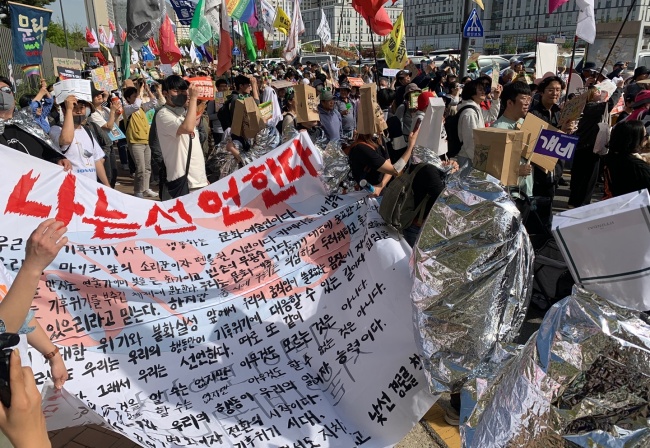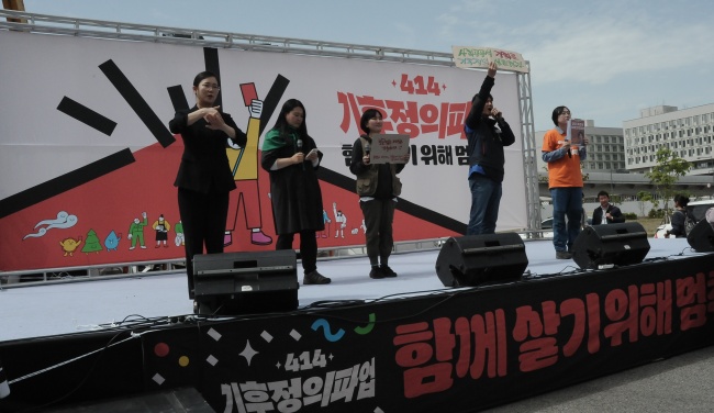 7개월 전입니다. 작년 9월 24일, 3만 5천명이 서울 도심 한복판 거리로 쏟아져나와 화석연료와 핵발전으로 생명을 파괴하는 지금의 이 구조! 가난한 나라와 가난한 이들, 노동자와 농민, 여성과 청소년을 착취해 소수의 최상위 계층을 배불리는 이 불평등 체제를 끝장내자고 외쳤습니다. 우리는 이대로 살 수 없다고 외쳤습니다. 그리고 맞이한 오늘 4월 14일, 우리가 외쳤던 그 수많은 요구와 구호들은 거둬들여진 것이 없고, 바뀐 것이 없이 오늘에 닿았습니다. 정부는 이렇게도 요지부동입니다. 모든 사회가 신속하게 가야할 탄소중립기본계획은 기업의 편에 선, 정의롭지 못하고 한가한 계획으로 수립되었습니다. 환경부는 생명을 희생시켜 돈을 벌겠다는 자들의 편에 서서 가덕도, 새만금 등 국토 곳곳에 신공항을 놓겠다, 국립공원 설악산에 케이블카를 놓겠다, 지리산에 산악열차를 놓겠다며 천연덕스럽게 생태학살 범죄를 이어가고 있습니다. 석탄화력발전소, 송전탑과 양수발전소, 농어촌파괴형 재생에너지, 핵발전소 수명연장과 핵폐기장 건설에 반대해 전국 곳곳에서 아직도 지역 주민들이 싸우고 있습니다. 발전노동자들이 해고에 맞서 정의로운 전환을 요구하는 투쟁을 이어가고 있습니다.