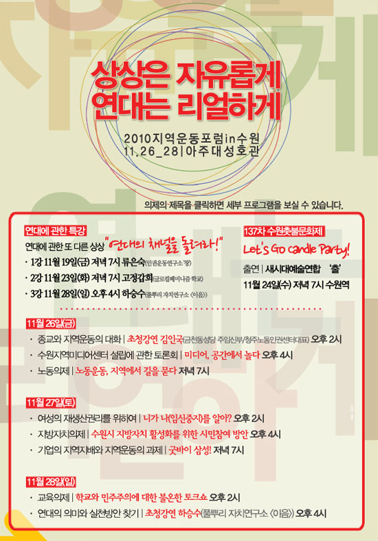 지역운동이 대안으로 이야기된지도 오래다. 그러나 정작 지역에서 운동하는 사람들에게 지역운동은 대안도 희망도 아니다. 다만 현실일 뿐이다. 그 이유는 무엇일까. 기대와 현실사이의 간극은 무엇일까. 여전히 그래서 우리는 질문만 던지면서 앞으로 나간다. 2010년 지역운동포럼in수원에서 기대하는 것은 그것이다. 길을 묻기도 하고 질문을 던지기도 하고 그리고 스스들이 찾은 답에 대한 의견을 묻기도 하면서. 어쩌면 우리가 하고 있는 것이 ‘연대’의 정체이지 않을까 하면서. 오시라, 만드는 것은 당신 몫이기 때문에 그만큼의 후회와 충족이 있으리라.