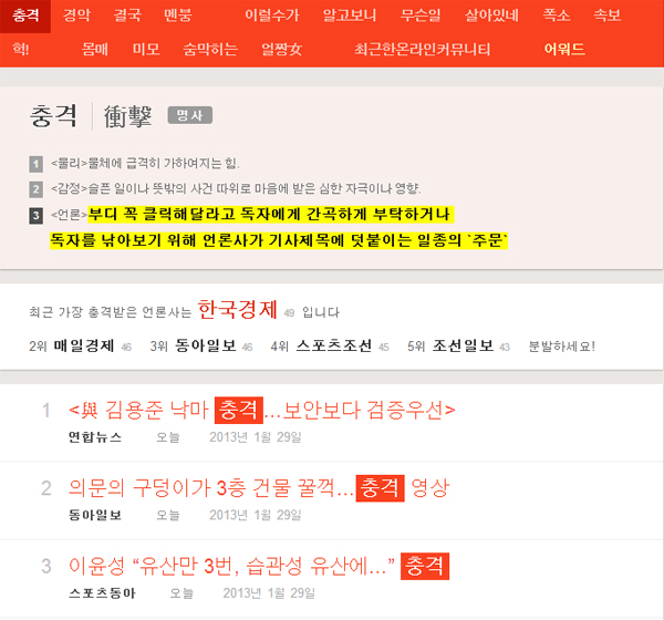 우리나라 언론이 자주 사용하는 ‘충격’,‘경악’ 등의 단어로 단순하게 검색엔진을 통해 데이터를 추출한 것입니다. 한국 언론의 현주소를 보여주기에는 몇 개의 검색어만이 필요하다는 통찰은 매우 흥미롭습니다.