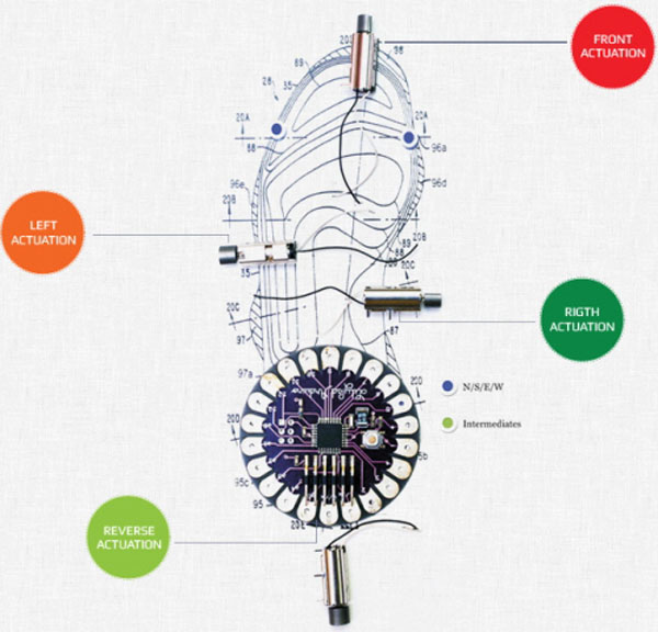먼저 이용자가 스마트폰의 ‘Le Chal’ 엡에 행선지를 말하면, 구글맵스에서 목적지까지의 최단 경로를 탐색합니다. 이 정보는 스마트폰과 블루투스(근거리 개인 무선 통신)로 연결된 신발에 전송되며, 동시에 이용자의 이동 경로는 스마트폰을 통해 GPS에 전송됩니다. 그리고 신발 밑창의 앞과 뒤, 그리고 왼쪽 오른쪽에 부착된 4개의 모터는 진동을 통해, 갈림길에서 사람이 길을 찾을 수 있도록 돕습니다. 예를 들어 우회전을 해야 하면 오른쪽 모터가 진동을 하는 방식입니다.