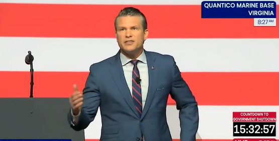 2025년 9월 30일, 미국 국방장관 피트 헤그세스가 버지니아주 콴티코에서 고위 군 지휘관들에게 연설한다. 전 세계에서 800명에 달하는 장군, 제독, 그리고 그들의 고위 부사관들이 갑작스러운 명령을 받고 한 장소로 집결했다. 출처: DOW Rapid Response
