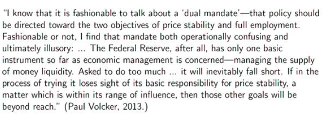"나는 ‘이중 목표(dual mandate)’ — 즉 물가 안정과 완전 고용이라는 두 가지 목표를 동시에 지향해야 한다는 이야기가 유행처럼 번지고 있다는 것을 알고 있다. 유행이든 아니든, 나는 이 목표가 실행적으로 혼란스럽고 궁극적으로는 환상에 가깝다고 본다. 연방준비제도는 본질적으로 경제 운영과 관련해 단 하나의 기본 도구만을 가지고 있다. 그것은 유동성 공급 관리다. 너무 많은 일을 맡기면... 필연적으로 실패할 수밖에 없다. 만약 그렇게 하려는 과정에서 연준이 물가 안정이라는 본래 책임을 잃어버린다면, 나머지 목표들은 결코 달성할 수 없을 것이다." — 폴 볼커(Paul Volcker), 2013년