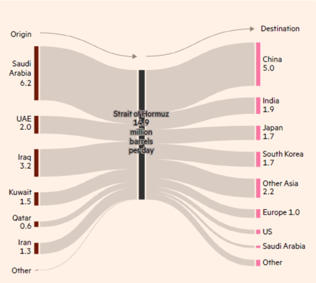 중국은 원유의 상당 부분을 중동특히 사우디아라비아에 의존하고 있지만이러한 사태에 대비하고 미국의 제재 가능성에 대한 우려 때문에 전략 비축량을 꾸준히 늘려 왔다따라서 중국은 어떤 공급 부족에도 비교적 잘 대응할 수 있는 위치에 있다또한 중국은 최근 몇 년간 중동 의존을 줄이기 위해 공급을 늘려 온 러시아와 남아메리카로부터 더 많은 원유를 계속 수입할 수 있다미국은 충분한 전략 비축량을 보유하고 있으며물론 자국 내 생산도 상당하다그러나 갈등이 장기간 지속될 경우글로벌 사우스의 많은 지역과 동아시아(일본과 한국), 그리고 러시아산 원유 공급이 중단된 유럽 전반의 상황은 훨씬 더 긴박해질 수 있다.