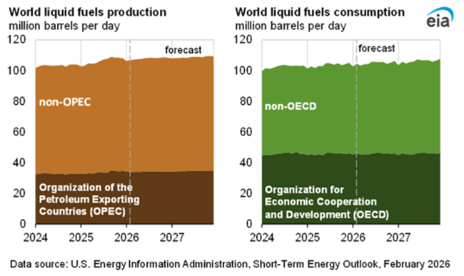 이 두 요인이 현실화하면 배럴당 유가는 세 자릿수로 올라갈 수 있다그러나 세계 경제 성장의 상대적 둔화와 재생에너지로의 전환 확대 때문에 전 세계 석유 생산과 공급은 전 세계 수요를 충분히 웃돌고 있다는 점을 기억해야 한다지난해 추정에 따르면 2025년 전 세계 액체 연료 소비는 하루 110만 배럴 증가했고올해는 하루 120만 배럴 증가할 가능성이 있다그러나 세계 석유 생산 증가 속도는 석유 소비 증가 속도를 계속 앞지를 것이며그 결과 2026년에는 석유 재고가 하루 310만 배럴 늘어날 것이다.