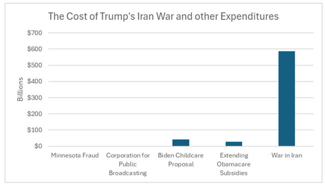 그래프는 몇 주 전에도 사용했지만그때는 트럼프가 이란 전쟁을 위해 2,000억 달러를 요구하던 상황이었다지금은 그보다 훨씬 더 큰 군사 예산 요구를 보고 있다나는 트럼프가 계속 부각시키는 미네소타 사기 사건이나 공영방송공사 예산 삭감도 그래프에 포함하지 않은 것이 아니다다만 트럼프의 군사 지출 규모에 비하면 너무 작아서 눈에 띄지 않을 뿐이다.