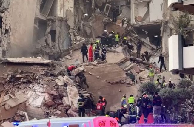 2026년 4월 8일 레바논 베이루트 바르부르 지역에서 이스라엘의 공습으로 파손된 건물에서 구조대가 작업을 벌이고 있다. 현장 구조대원들은 최소 6명이 사망했으며 추가로 실종자가 있다고 밝혔다. 출처: 현지 방송 화면 갈무리
