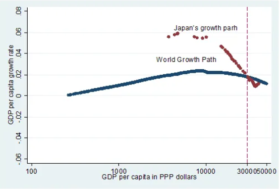그렇다면 많은 사람들이 중국의 미래로 제시하는 일본과 비교하면 어떨까아래 그림에서 일본 역시 성장기 동안 세계 평균보다 훨씬 높은 성장률을 기록했다일본의 1인당 GDP가 약 1만 달러(PPP 기준)일 때 연간 성장률은 거의 6%였으며이는 세계 평균 약 2.5%보다 훨씬 높은 수준이다그러나 약 3만 달러(PPP 기준그래프의 점선 참조이후 일본의 둔화는 매우 급격하게 진행됐고한때는 동일 소득 수준의 세계 평균보다 낮은 성장률을 기록하기도 했다이후 일본은 다시 세계 평균 경로로 복귀해 현재는 특별히 좋지도 나쁘지도 않은해당 소득 수준의 평균적인 성장률을 보인다.