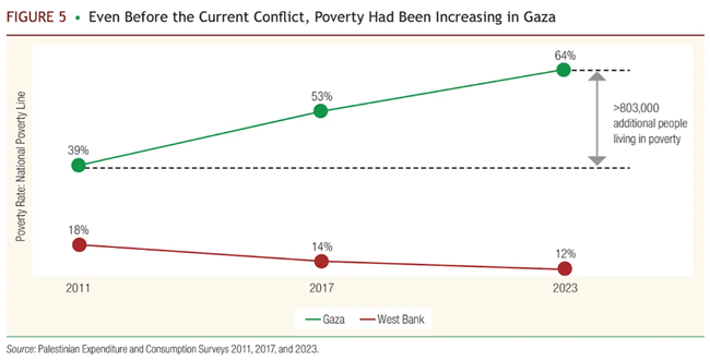 2023년 이전부터 가자지구와 서안지구 경제의 격차는 이미 극명했으며, 이는 이스라엘이 가자지구를 장기간 봉쇄한 결과를 반영한다.