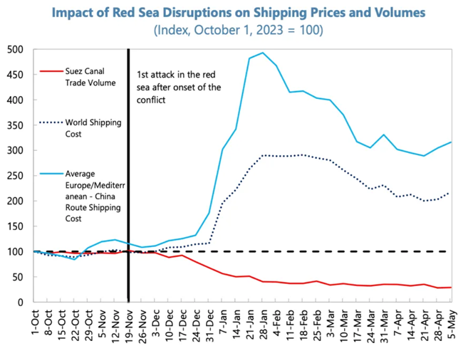 홍해의 혼란이 이 지역의 해운 물동량과 가격에 타격을 주고 있다.